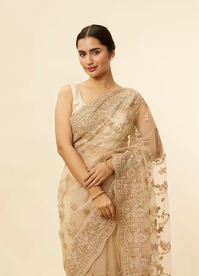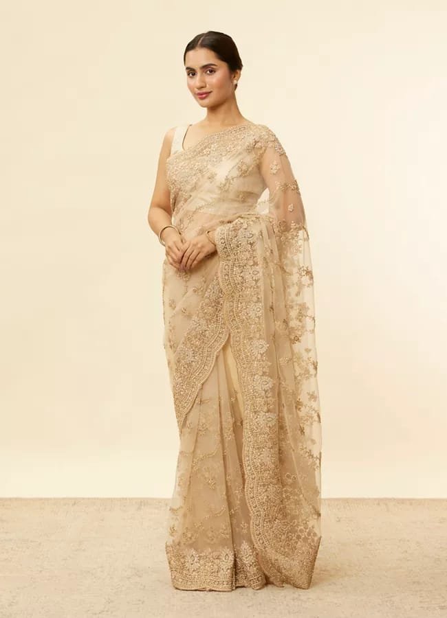Fabric & Design Crafted from premium silk, the saree features delicate floral and geometric motifs woven in gold and off-white threads. The pallu carries a slightly denser design, adding depth without overpowering the simplicity of the base. The fabric is lightweight, breathable, and offers a smooth, flattering fall.