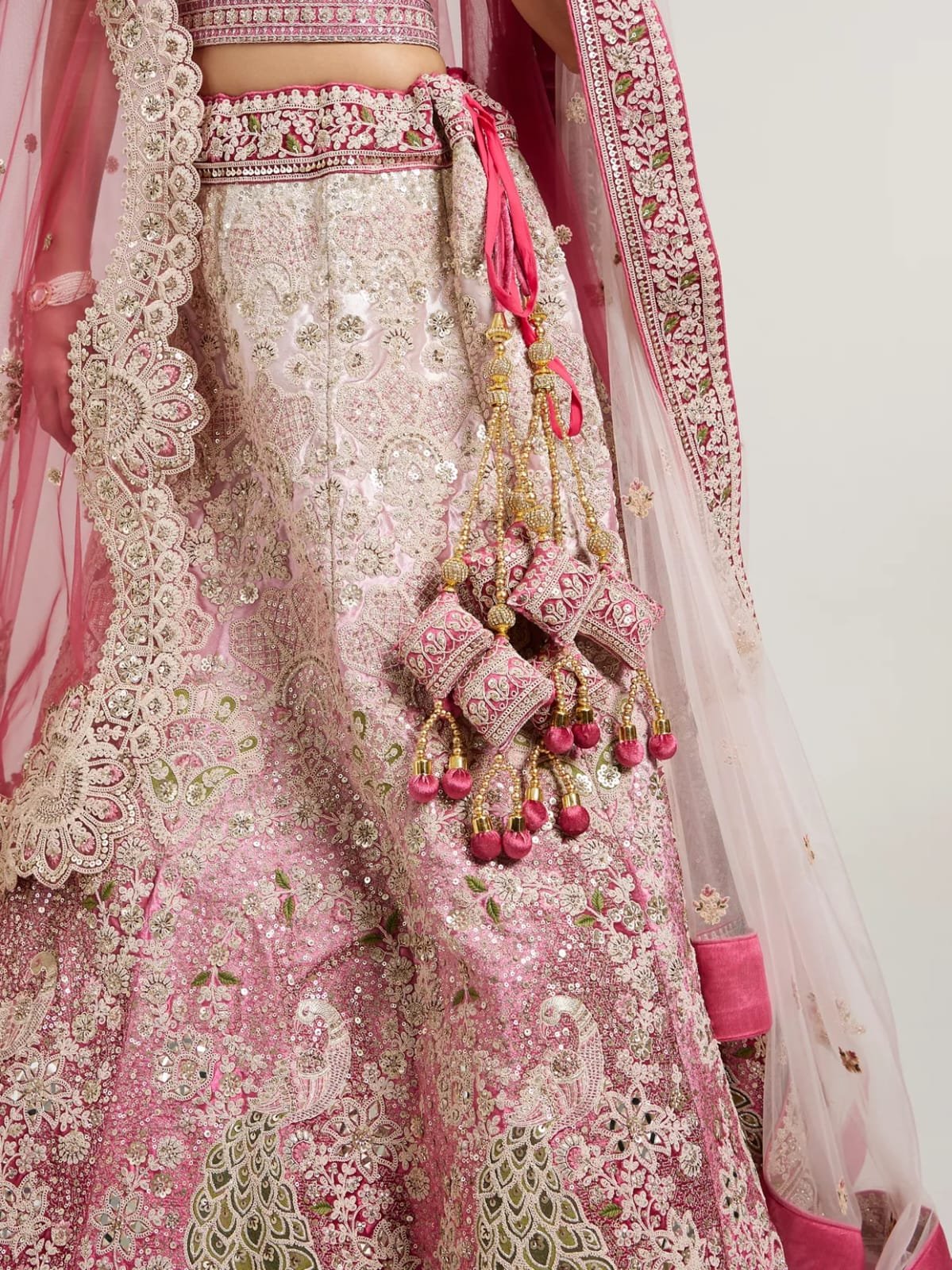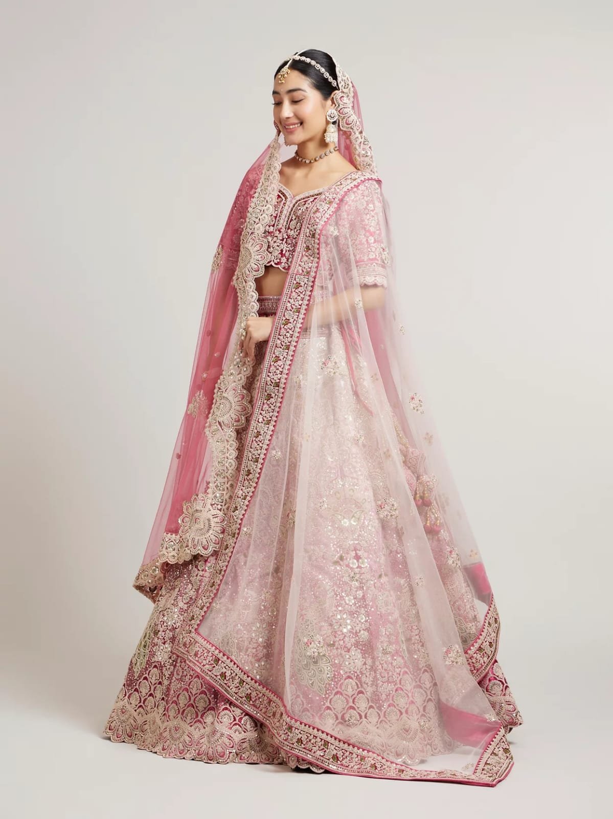 This bridal lehenga choli is a stunning fusion of tradition and opulence, crafted for the bride who wants to shine with grace and grandeur. The soft pink and cream tones evoke romance and purity, while the intricate embroidery and embellishments reflect timeless craftsmanship. Ideal for weddings, receptions, and ceremonial portraits, this ensemble is designed to make every moment unforgettable.