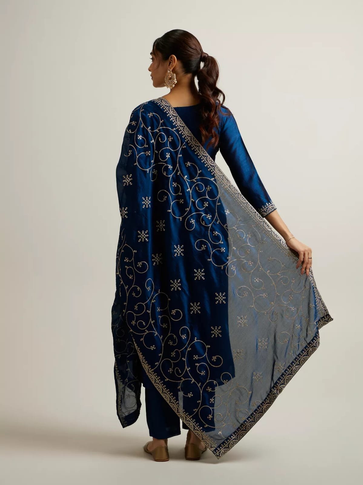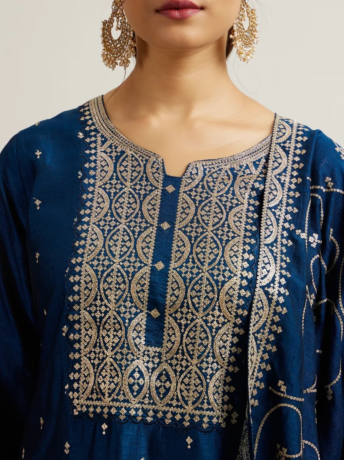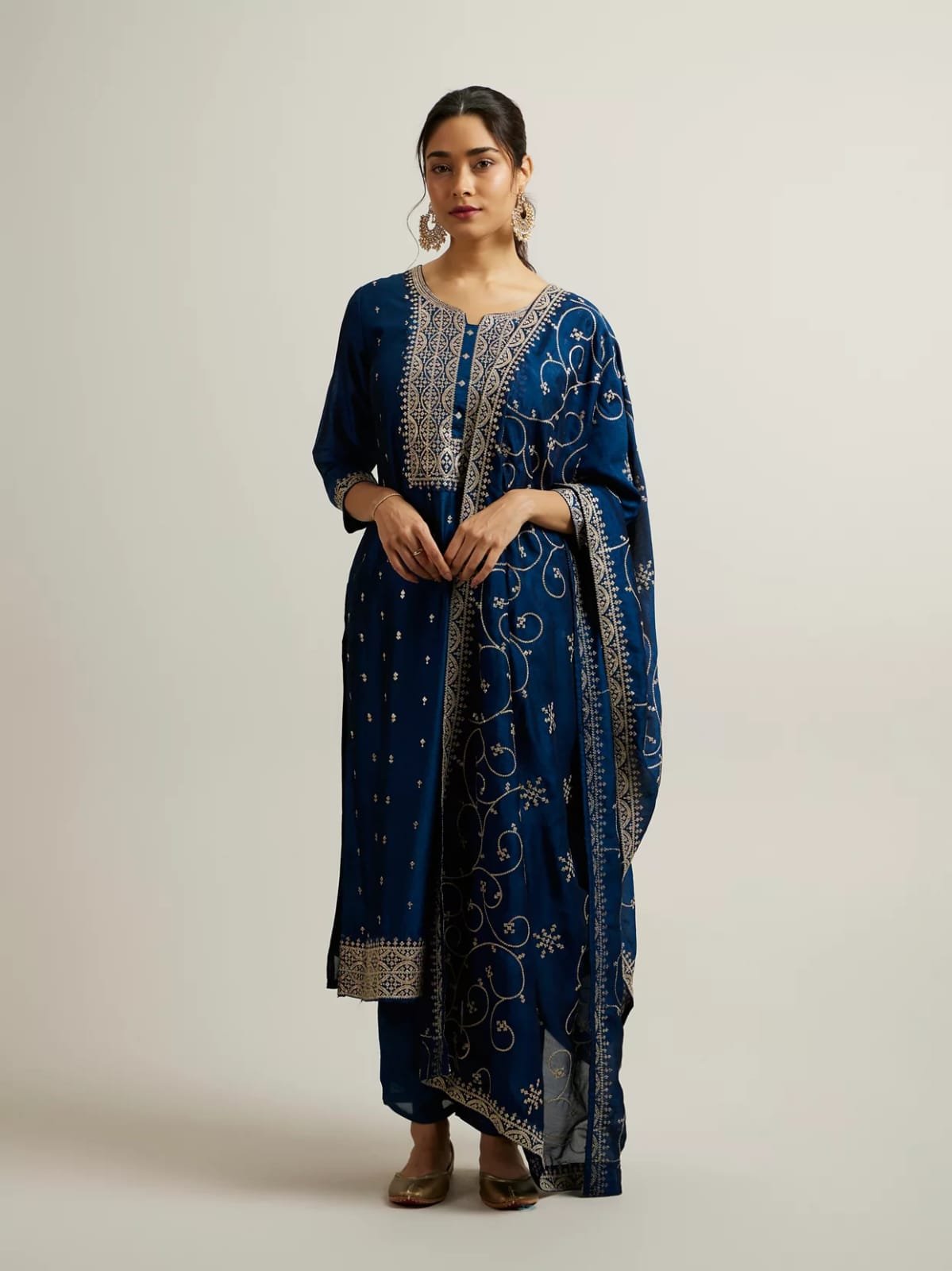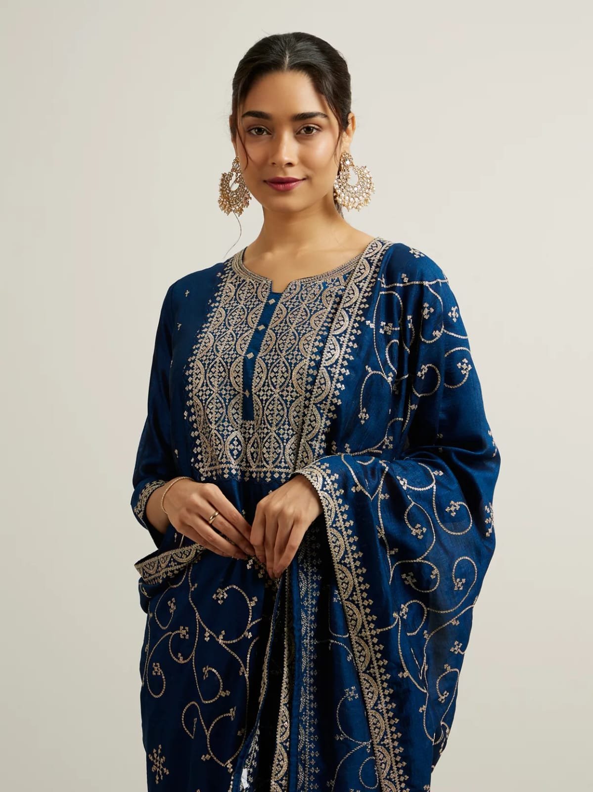 A regal dark blue salwar kameez with intricate gold embroidery—perfect for festive occasions, weddings, and cultural celebrations.